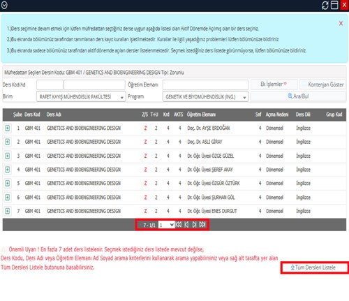 Öğrenci Bilgi Sistemi ders kayıt ekranında, çok şubeli derslerde (Genetics and Bioengineering Design, Graduation Project) “Tüm Dersleri Listele” butonu kullanılarak ilgili derse ait diğer şubelerin görüntülenmesi mümkündür.